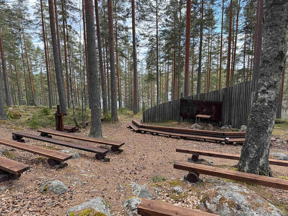Tämä avonainen metsäaukio toimii luonnollisena kirkkona – paikkana, jossa luonto on katto, maa on lattia ja hiljaisuus on sana. Täällä ihminen ei ole yleisö, vaan osa maisemaa. Penkit ovat kuin kutsu pysähtyä ja kuunnella, ei saarnoja vaan metsää.