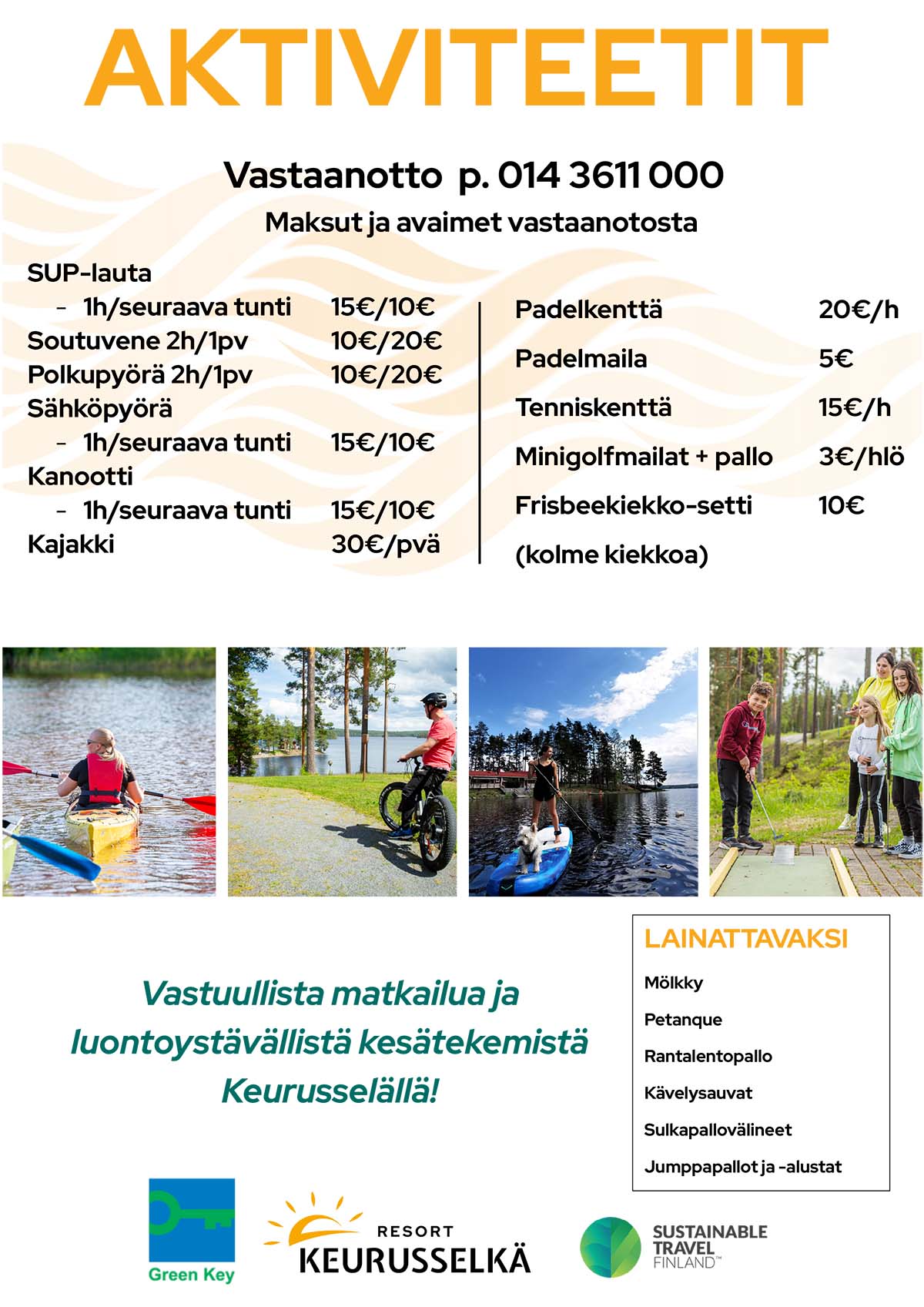 Keurusselän upea luontoympäristö tarjoaa liikuntamahdollisuuksia kevyestä patikoinnista luontopolulla aina useamman tunnin sauvakävelyretkiin saakka. Ja mikä parasta, retki alkaa aina hotellin tai loma-asunnon ovelta!