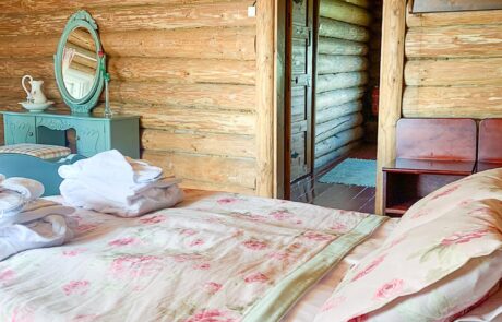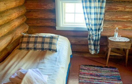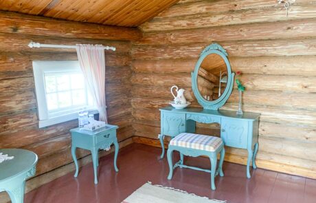 Pirtin yläkerrasta löytyy kauniisti sisustettu morsiushuone ja anopinhuone. Näistä voit kesällä varata rauhallisen ja romanttisen majoituksen kauniilla järvinäkymillä.