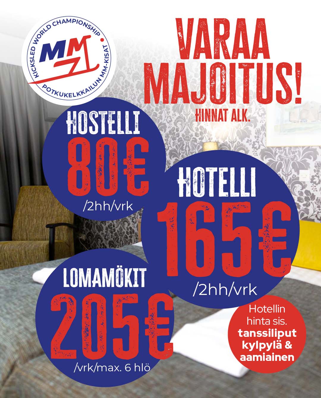 2 vrk bilepaketti 130€ / hlö kahden hengen huoneessa ( 1hh 190€)